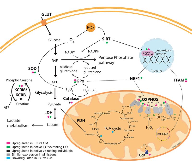 We found that many cellular pathways are differentially expressed in resting and active states. Some of the pathways involved are aerobic metabolism, oxidative phosphorylation, reactive oxygen species scavengers, transcription factors important for mitochondrial biogenesis and even enzymes involved in phosphocreatine cycle.