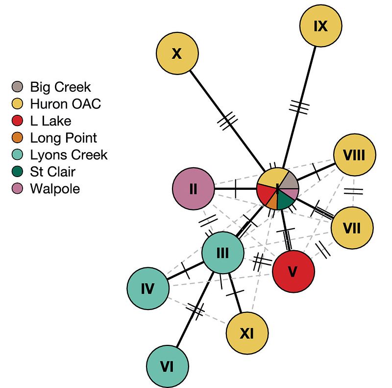 In this study, my colleagues, Drs. Frances Hauser and João Pedro Fontenelle, and I look at the population genetics of Lake Chub Sucker, a threatened species in the Great Lakes. We identified one location in Canada (Lyons Creek) that is genetically different from the rest, which would require recovery efforts due to its genetic isolation from the other populations.