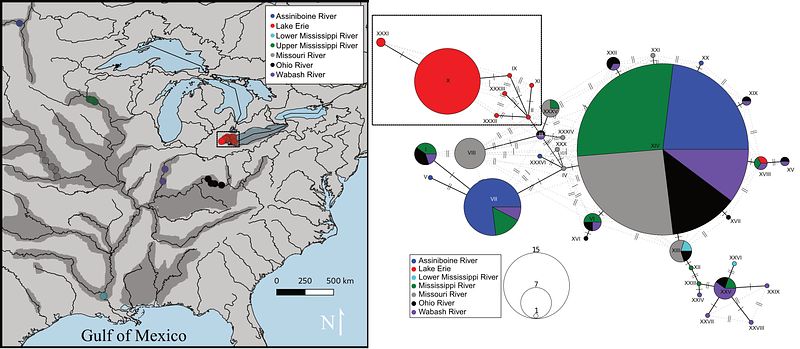 Map of Silver Chub samples collected across North America, and haplotype network analysis showing Lake Erie haplotype being unique from all other locations.