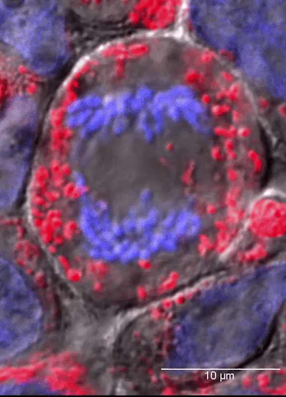 HEK293 cells during cell division showing chromosome segregating (blue) and mitochondria (red) moving dynamically to allow this metabolic process.